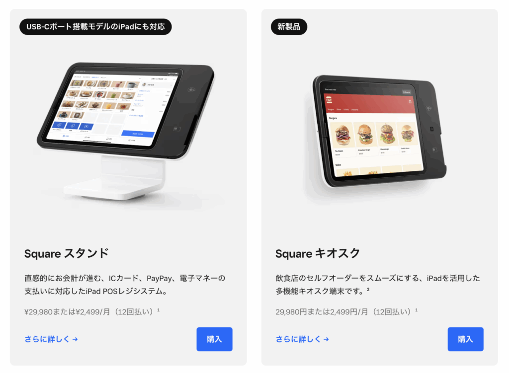 - Square:複数の種類のリーダー(接触型、非接触型、モバイル)やPOSレジスター、キオスク端末など、ビジネス規模に応じた選択肢が広い。