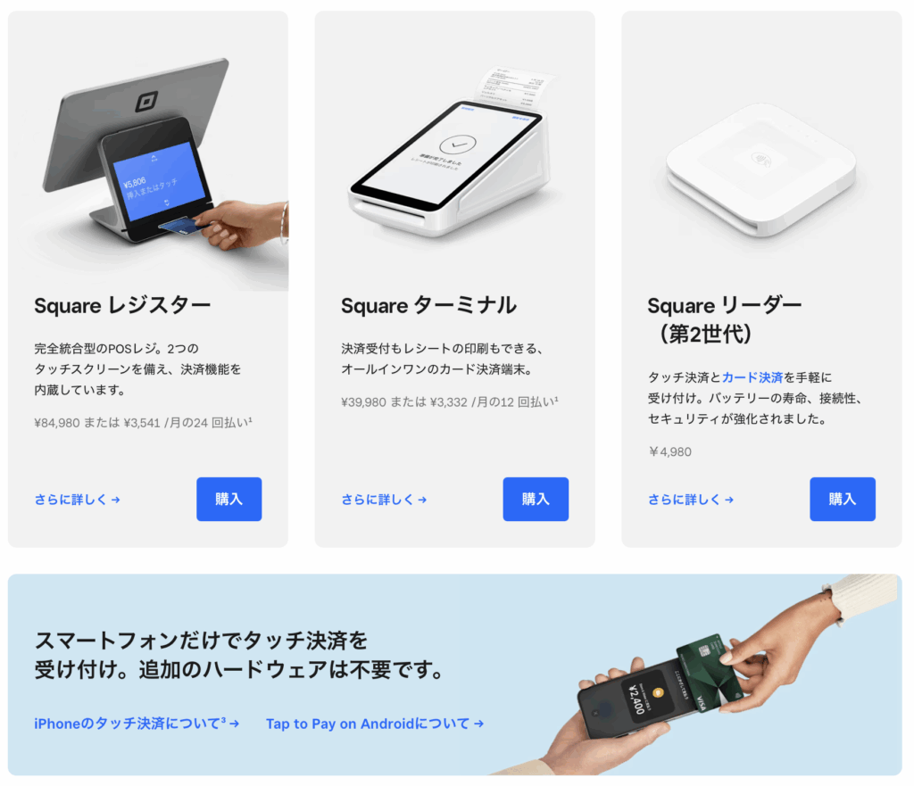 - Square Reader:接触型と非接触型があり、クレジットカード、デビットカード、Apple Pay、Google Payなどの決済に対応。