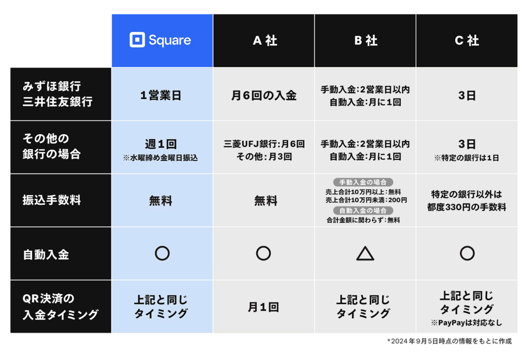 - 即時決済と迅速な入金:Squareは売上金の入金が最短翌営業日と非常に早く、キャッシュフローの管理が容易です。